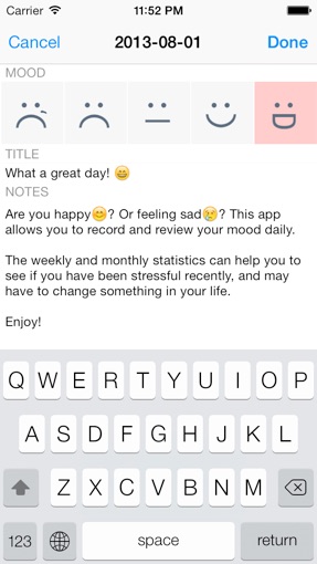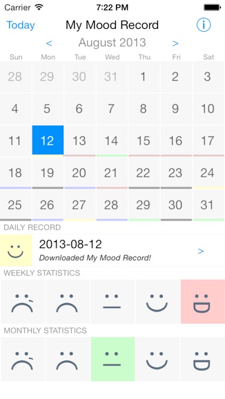 A simple app that allows you to record and review your mood daily. A monthly calendar view with color map allows you to know your past moods at a glance. Weekly and monthly statistics, as well as data export feature, are available in the full version. These statistics can help you to see if you have been stressful recently, and may have to change something in your life.
